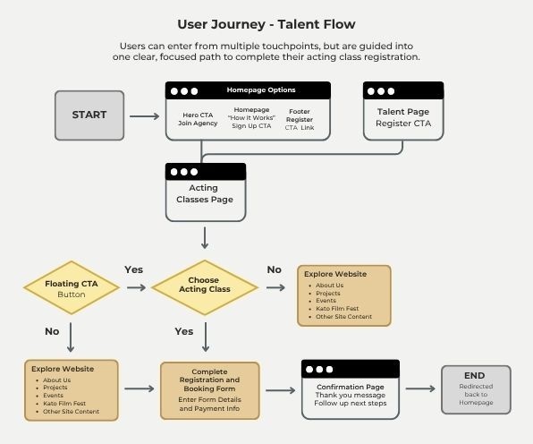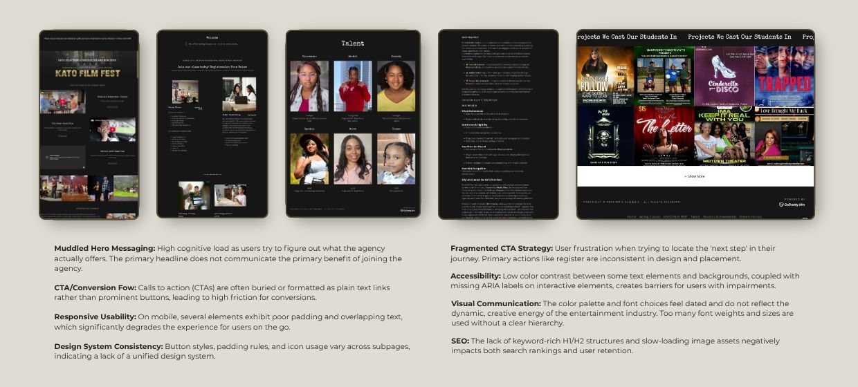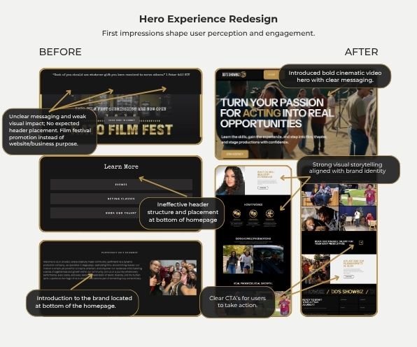 Designed a concept-driven redesign for a performing arts company, combining UX strategy and visual storytelling to improve clarity, strengthen brand perception, and support talent engagement and booking flows.