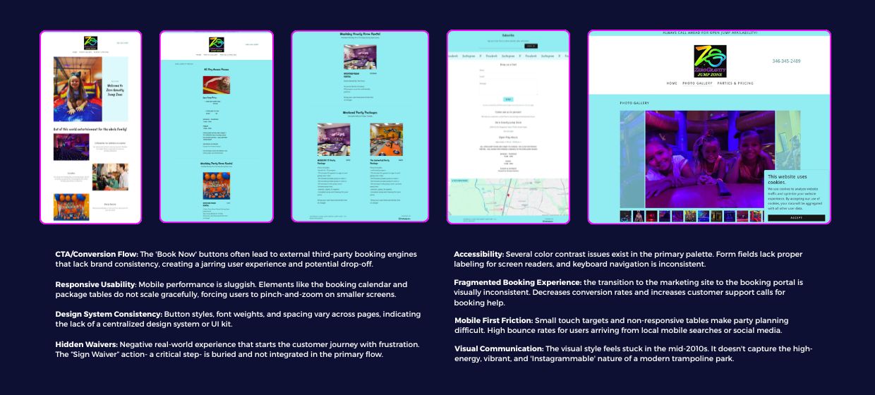 Zero Gravity Jump Zone is a family entertainment center offering inflatables, arcade games, and birthday party packages. The existing experience relied on fragmented pages and external booking flows, creating inconsistencies that disrupted user trust and made it difficult for parents to plan events efficiently.